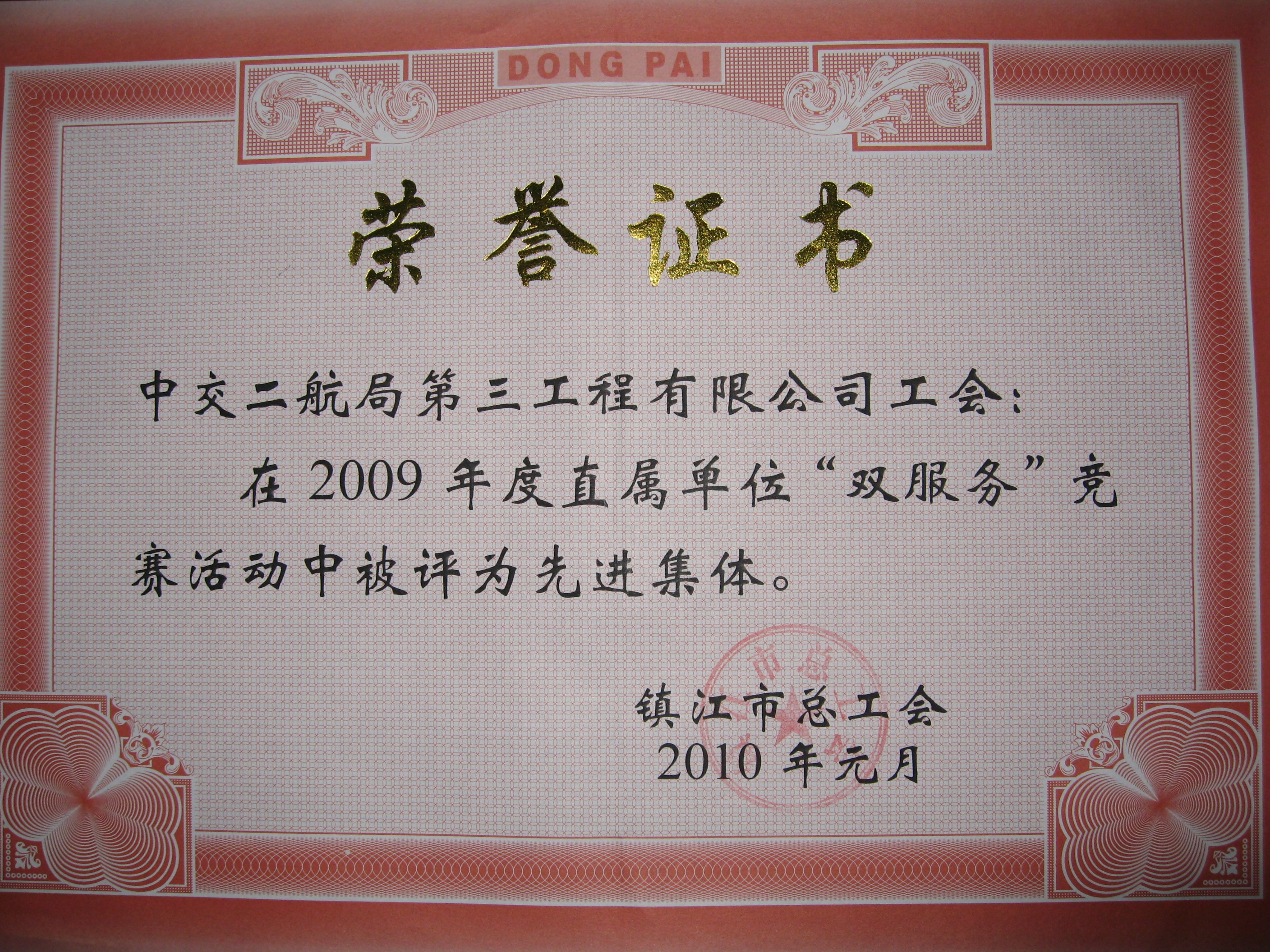 公司工会被镇江市总工会授予2009年度“双服务”先进整体、先进小我私家声誉称呼