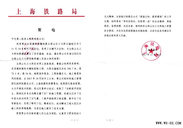 五峰山大桥北锚碇沉井准确下沉到位后,,,,,引起普遍关注,,,,,上海铁路局发来贺电称,,,,,贵公司“乐成解决了超大型沉井施工的天下级难题,,,,,为类似施工提供了手艺支持。。。。。。。”贺电全文如下: