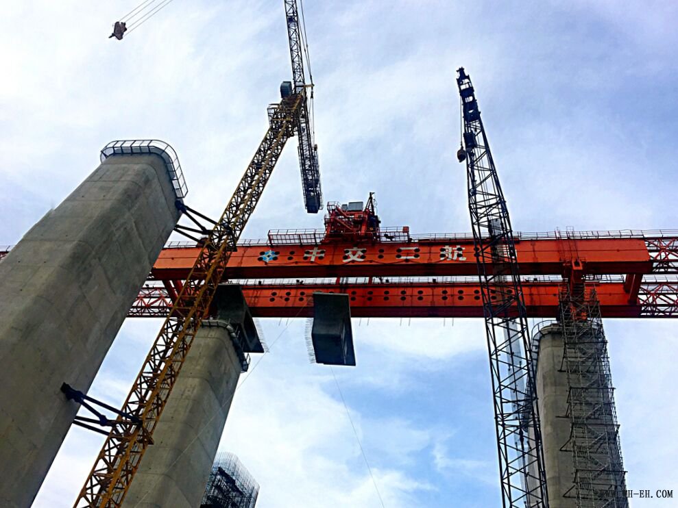 节段梁在安徽芜湖裕溪口的预制厂举行预制,,,,,,船运至五峰山大桥主墩节段梁暂时码头,,,,,,并由200吨的龙门吊吊至200吨的运梁台车上,,,,,,运到北引桥合建段节段梁架设施工现场。。。。。
