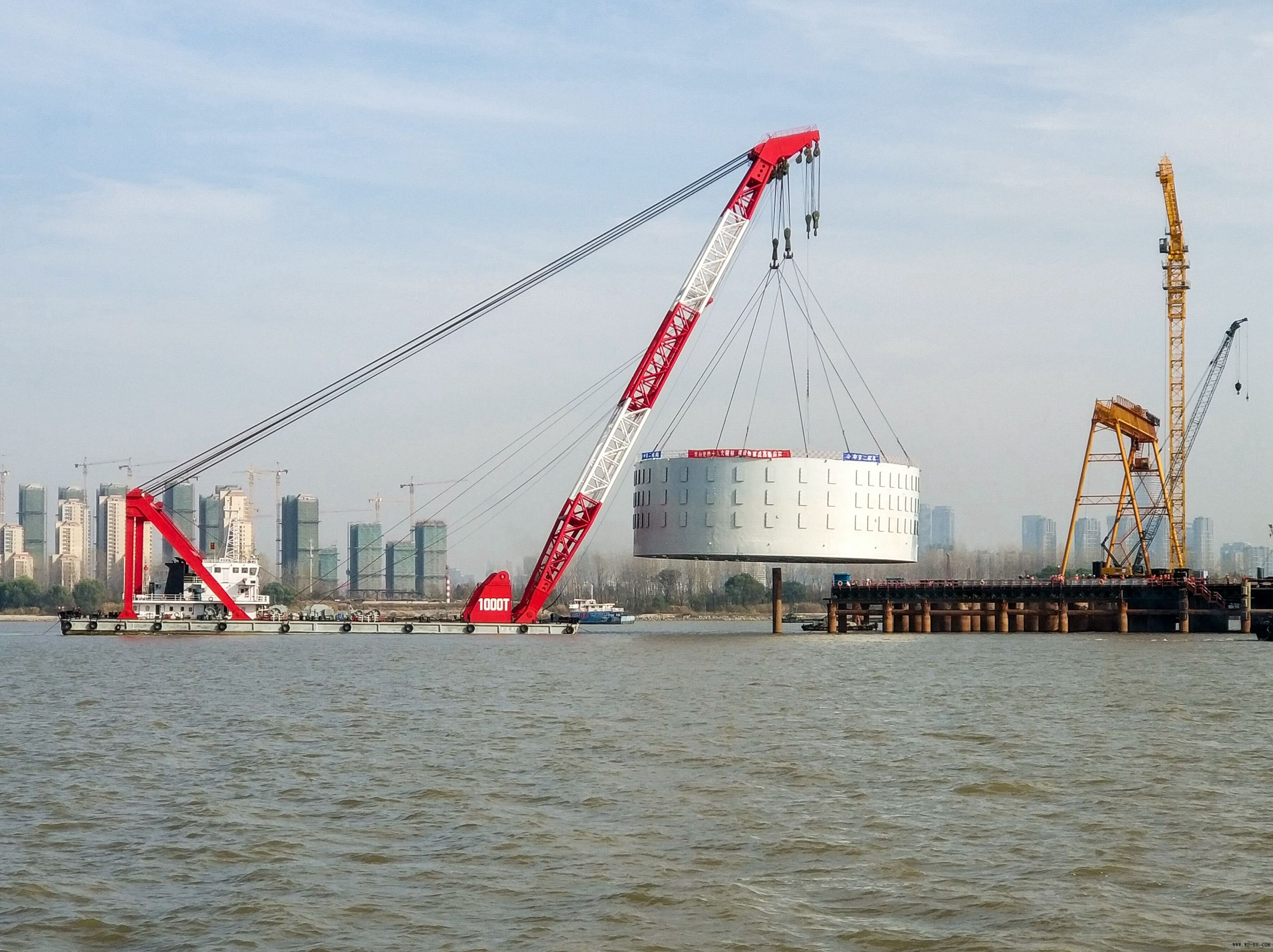 中墩接纳30根钻孔桩基础,,,,,,,,承台为圆形结构。。。。。。。。承台施工接纳双壁钢吊箱,,,,,,,,整个钢吊箱重约834吨。。。。。。。。上午10点,,,,,,,,在向导小组现场总指挥的指挥下,,,,,,,,1000吨起重船“亚龙618”徐徐吊起了钢吊箱。。。。。。。。经由一直的调解,,,,,,,,历经8个小时,,,,,,,,钢吊箱底板的30个孔洞与钢护筒完善对接,,,,,,,,吊装圆满乐成。。。。。。。。