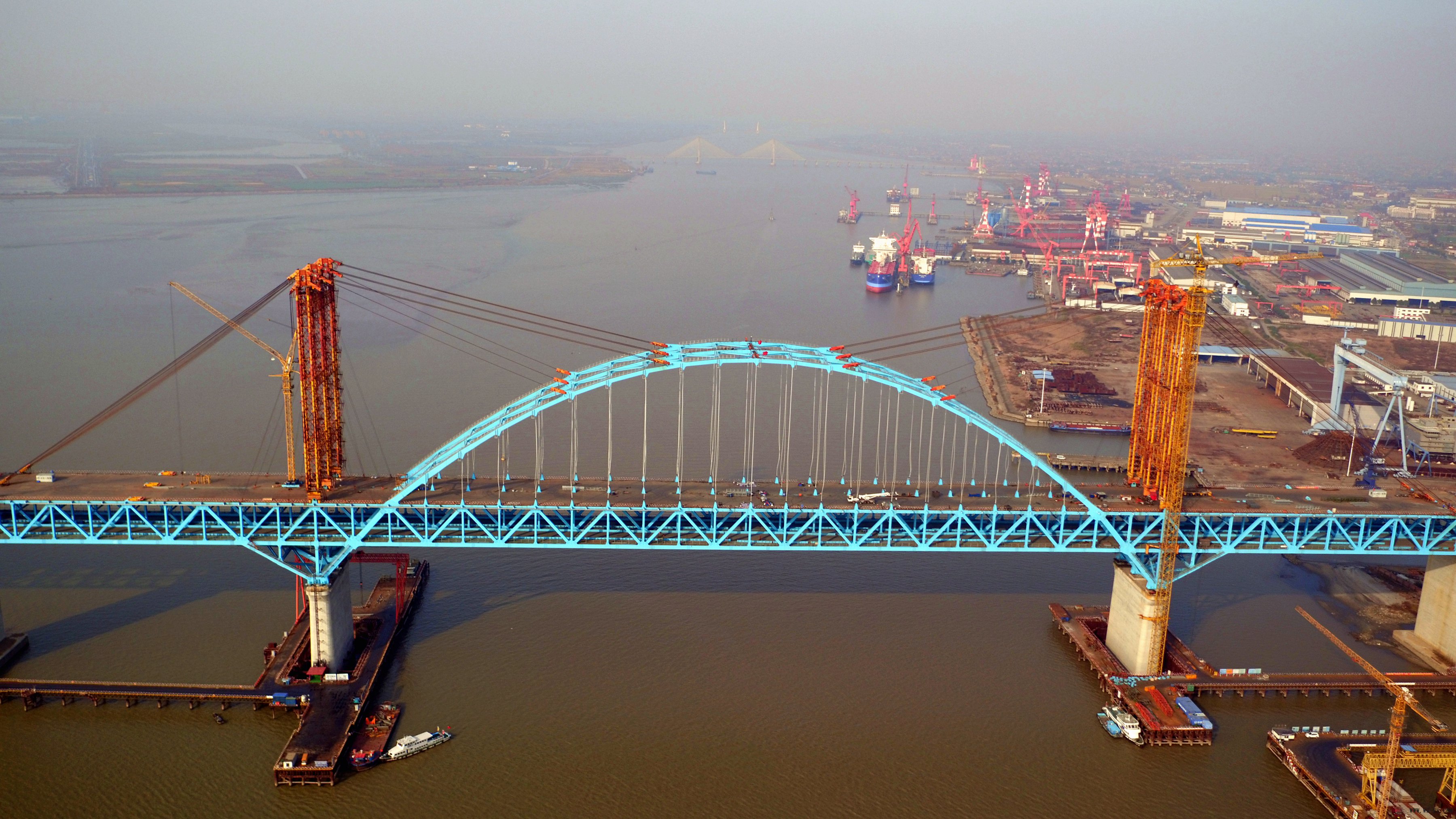 该桥拱肋于今年10月22日合龙后,,,,,,,,便转入吊杆装置施工阶段。。。。。吊杆笔直毗连于钢梁与拱肋结构之间,,,,,,,,钢梁桥面遭受载荷后,,,,,,,,通过吊杆把荷载受力先转达到拱肋上,,,,,,,,再由弧形结构的拱肋将力量转达至3号、4号两个主墩。。。。。