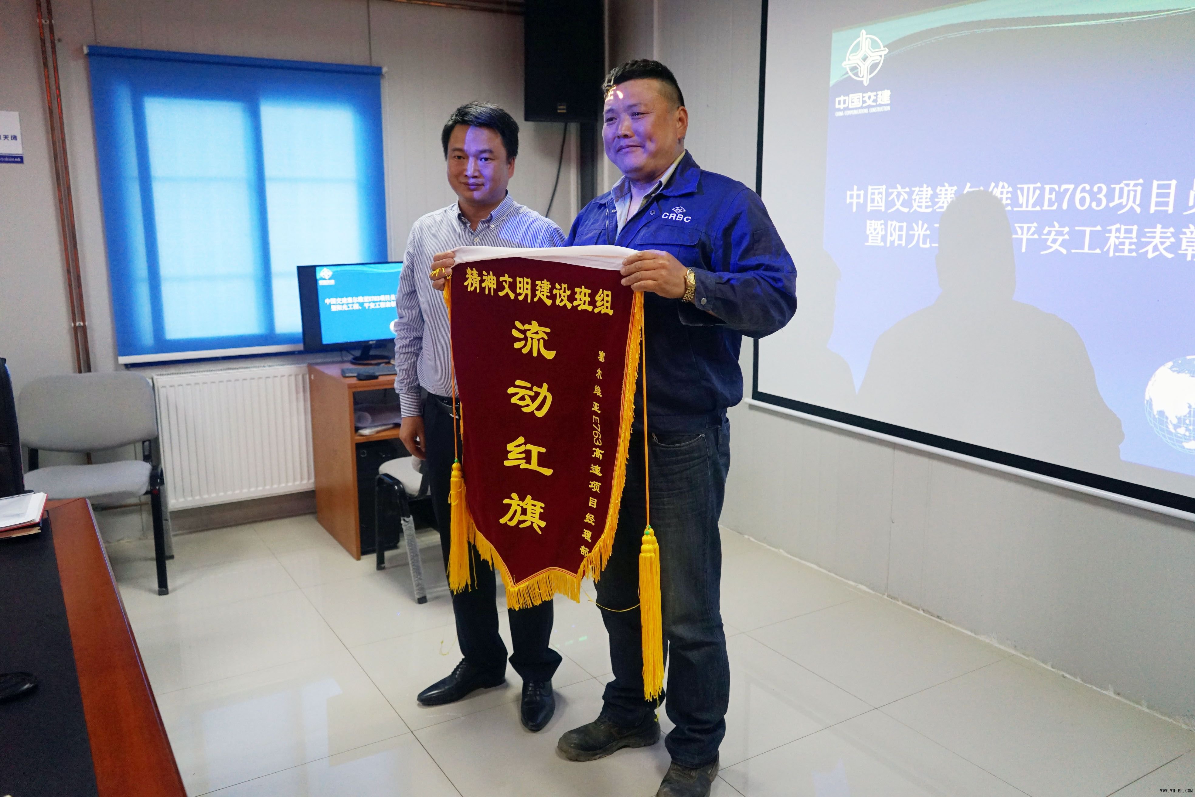 5月19日,,,,,,,塞尔维亚E-763项目民工顾介聪从项目书记手中接过“阳光卫士”流动红旗,,,,,,,他兴奋之余信心满满地亮相,,,,,,,“希望接下来每月都能守住这面旌旗,,,,,,,争取让‘流动’酿成牢靠。。。。。。”