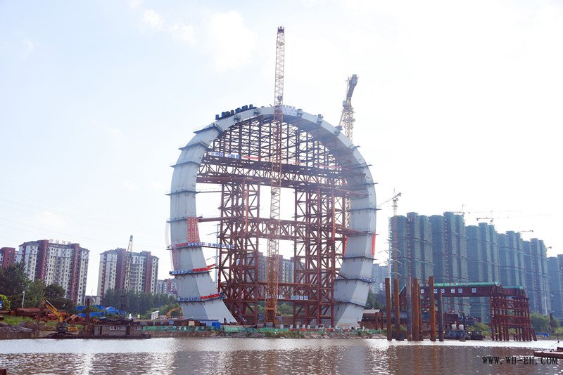 京杭运河淮海路大桥索塔是接纳空间异型拱形结构的钢塔,,,,,为通体纯白色的椭圆形,,,,,高75米,,,,,宽60米,,,,,分为27个节段依次装置,,,,,且左右塔腿顺桥向1:2斜向,,,,,形成左右旋转对称,,,,,合龙位置在钢塔最高节段。。。。。由于每个节段形状均不规则,,,,,单节段最大重量近达200吨,,,,,新颖雅观的桥型设计、高精度加工、超重超大构件的高空准确装置,,,,,都给合龙带来了难题。。。。。