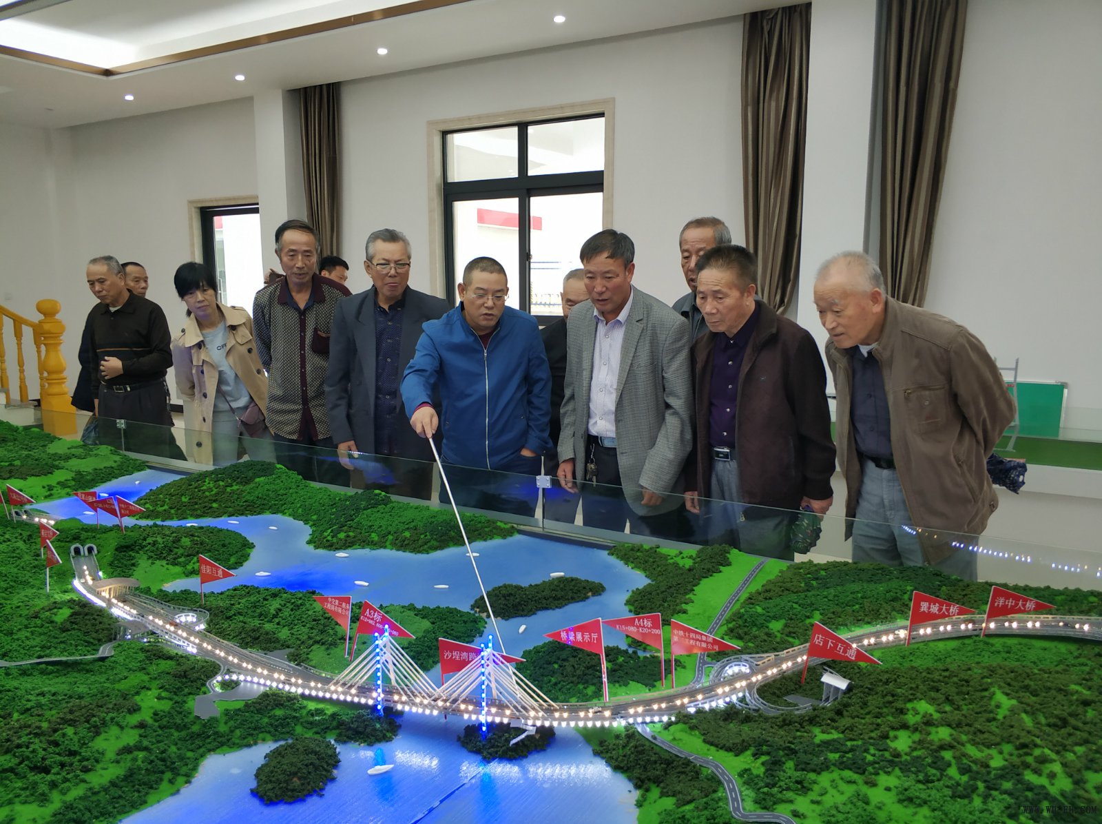 项目书记首先对老向导们的到来体现幸运。。。。。在桥梁展示厅的桥梁模子沙盘前,,,,,他详细先容了工程概况,,,,,并就现场施工管理、大桥建设特色等方面逐一举行解说。。。。。当退休老干部们相识到项目各项事情希望顺遂,,,,,项目建设得越来越好的时间,,,,,纷纷露出欣慰的笑容。。。。。