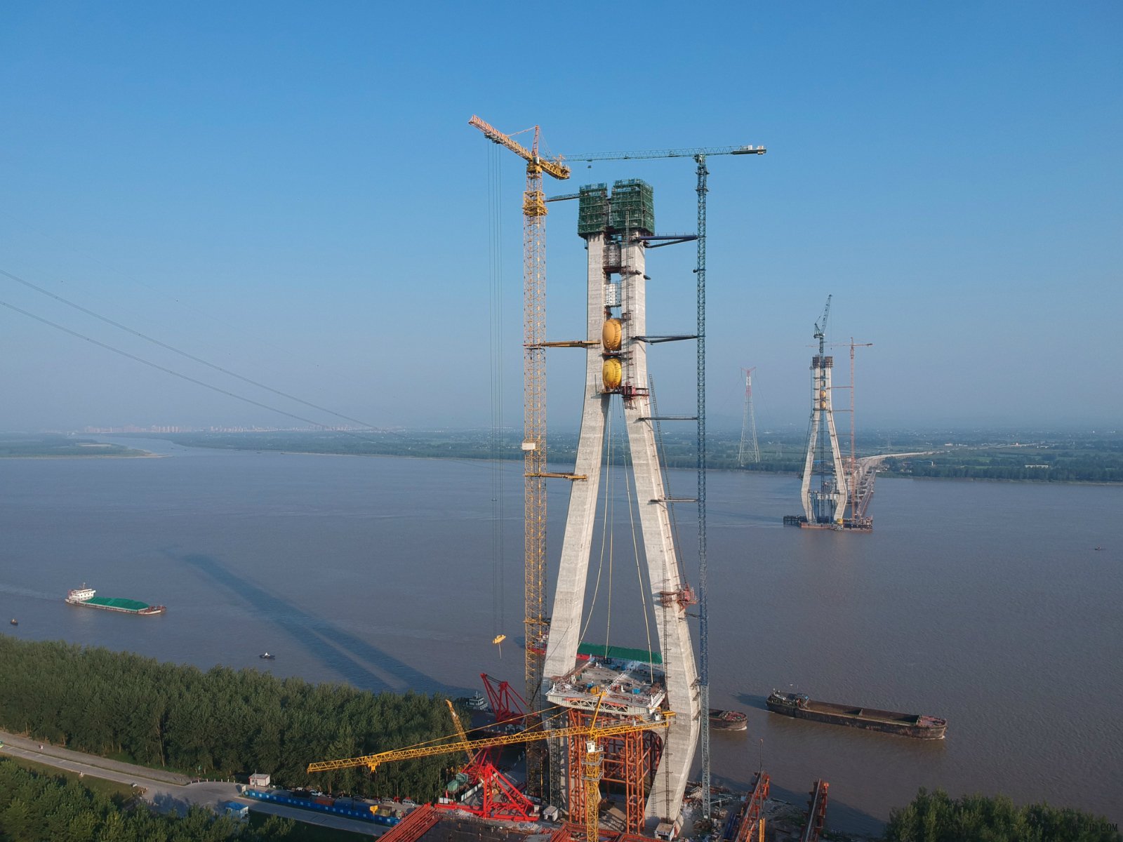 大桥主塔两上塔柱之间通过6 道钢梁毗连,,,,,108根斜拉索分六组荟萃,,,,,划分依次从6颗琉璃黄色钢球中穿过,,,,,锚固于上塔柱六道钢横梁上,,,,,整体呈放射状伸向桥身。。。。。 。阻止古板施工中主塔被拉伸的困扰,,,,,不但解决了锚固区混凝土开裂问题,,,,,更能“拗造型”,,,,,从150多米到220多米高空穿出的金色拉索,,,,,犹如万道“佛光”,,,,,普照在八百里皖江上,,,,,阳光下熠熠生辉,,,,,气焰特殊。。。。。 。