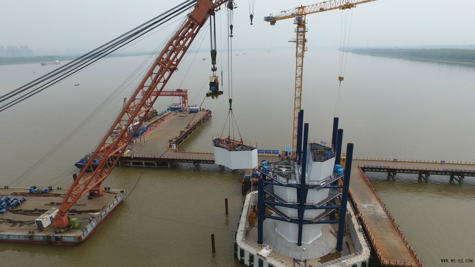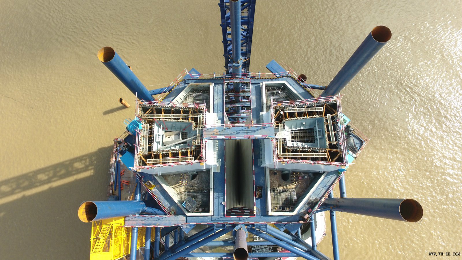 为最大限度实现工厂化、装配化加工 ,,,, ,,,,项目立异工艺功法 ,,,, ,,,,钢混组合索塔钢壳节段在工厂内加工 ,,,, ,,,,索塔钢筋在钢壳加工时同步装置 ,,,, ,,,,桥位现场装置钢壳节段 ,,,, ,,,,毗连竖向主筋讨论即可。。。。。 。。。下塔柱钢壳节段重180吨 ,,,, ,,,,接纳起重船吊装 ,,,, ,,,,中上塔柱钢壳节段最重100吨 ,,,, ,,,,接纳2000吨•米塔吊吊装。。。。。 。。。钢壳吊装后 ,,,, ,,,,毗连匹配件及竖向主筋、焊接内外壁板后即可浇筑混凝土。。。。。 。。。下塔柱作业平台使用箱梁0#块支架 ,,,, ,,,,中上塔柱作业平台接纳专门设计的液压爬升操作平台。。。。。 。。。