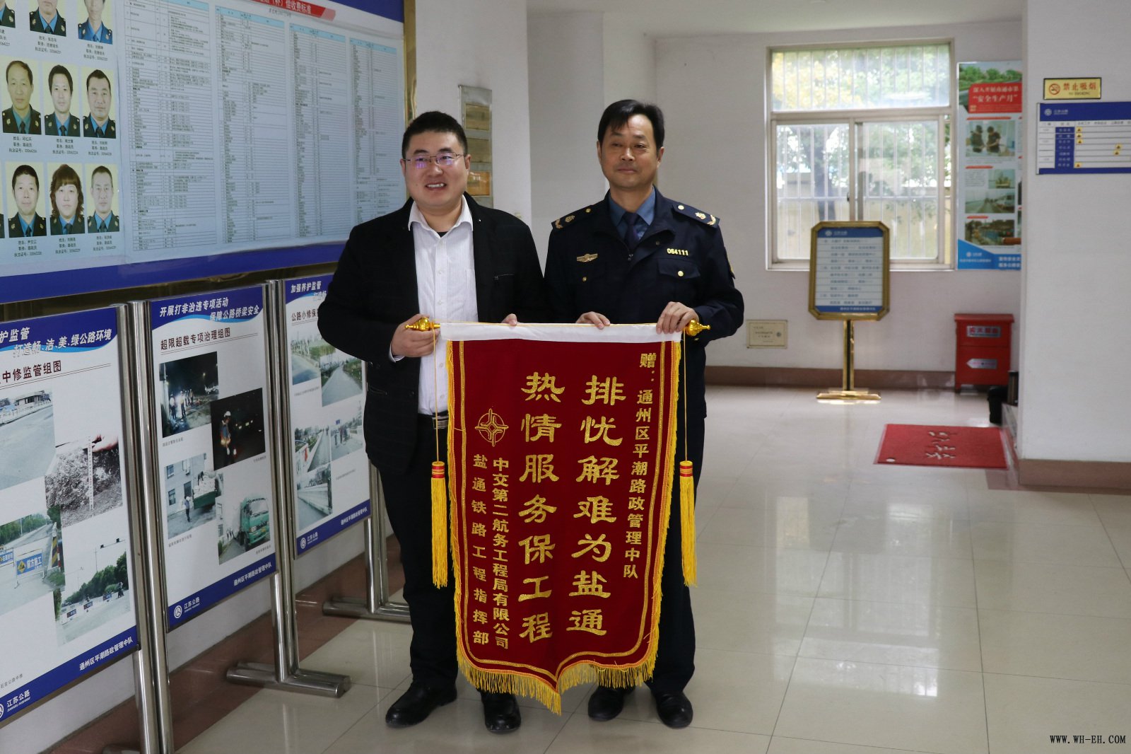 11月23日,,,,,,一面写有“排忧解难为盐通,,,,,,热情服务保工程”的锦旗送到了南通市通州区平潮路政管理中队,,,,,,表达了盐通铁路指挥部与建设单位优德88官网网站二航局对该中队一直以来提供的资助和服务的谢谢。。。。。。。
