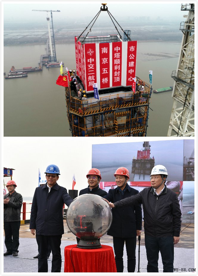 3月1日,,,,,,由公司承建的南京五桥传来了好新闻:最高主塔——中主塔顺遂封顶。。。。。。。。此前,,,,,,大桥的南北主塔业已封顶。。。。。。。。二航局总司理张鸿,,,,,,总司理助理、生产管理部总司理罗洪成,,,,,,四公司副总司理吴天寿,,,,,,到建设现场加入封顶仪式。。。。。。。。