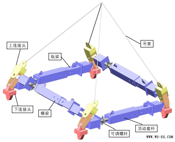“一种精度可调的压杆式吊具”专利中的压杆式吊具具有结构精练、受力明确、装置利便、顺应性强等四个特点。。。。。。。通过纵、横梁长度可调装置, ,,,, , ,吊具可以很好适用于尺寸渐变构件的吊装需要。。。。。。。该吊具已在南京五桥主桥钢混组合索塔施工中举行了运用, ,,,, , ,有用包管了索塔钢壳吊装历程中的结构清静以及变形控制。。。。。。。