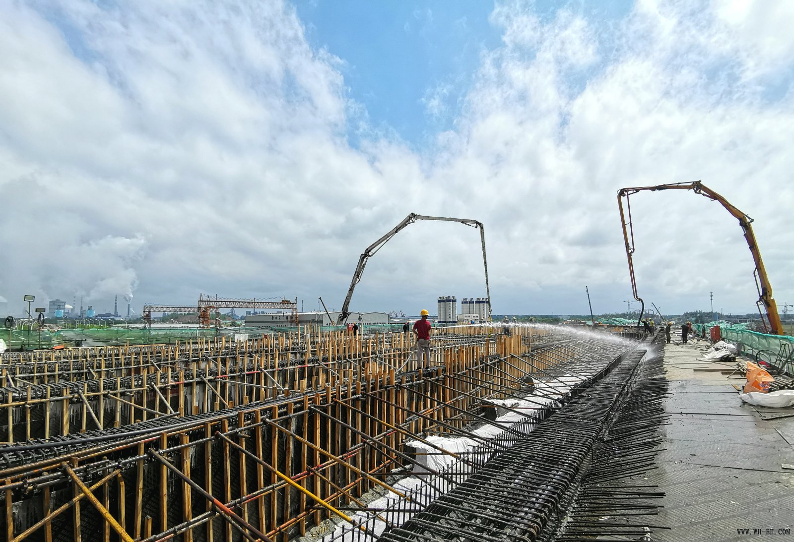 浦珠路主线桥一连箱梁混凝土施工,,,,,,,,分为第一次浇筑底板和腹板,,,,,,,,第二次浇筑顶板的两次浇筑成型。。。。。从5月17日上午最先,,,,,,,,经由现场施工手艺员二天一夜奋战,,,,,,,,到18日破晓时分竣事,,,,,,,,共完成混凝土方量2115立方。。。。。