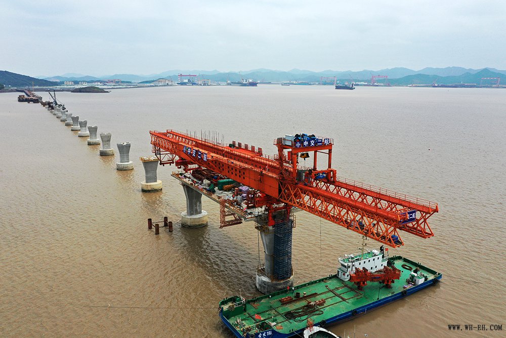 6月8日,,,,,,,,公司宁波舟山港主通道DSSG04标长白互通50米F匝道桥顺遂完成首跨节段梁拼装架设,,,,,,,,标记着长白互通桥正式进入上部施工工序。。。。。。。