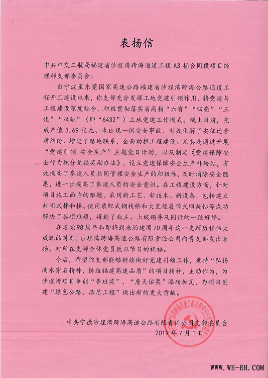 在今年年头,,,,,,项目部就斩获业主单位设置的全线唯逐一个“先进项目司理部”。。。。。。此次表扬信更是对项目党支部前期事情的充分一定和全体员工的有力鼓舞。。。。。。项目部将再接再厉,,,,,,为项目建设“绿色公路、品质工程”做出新的更大孝顺。。。。。。