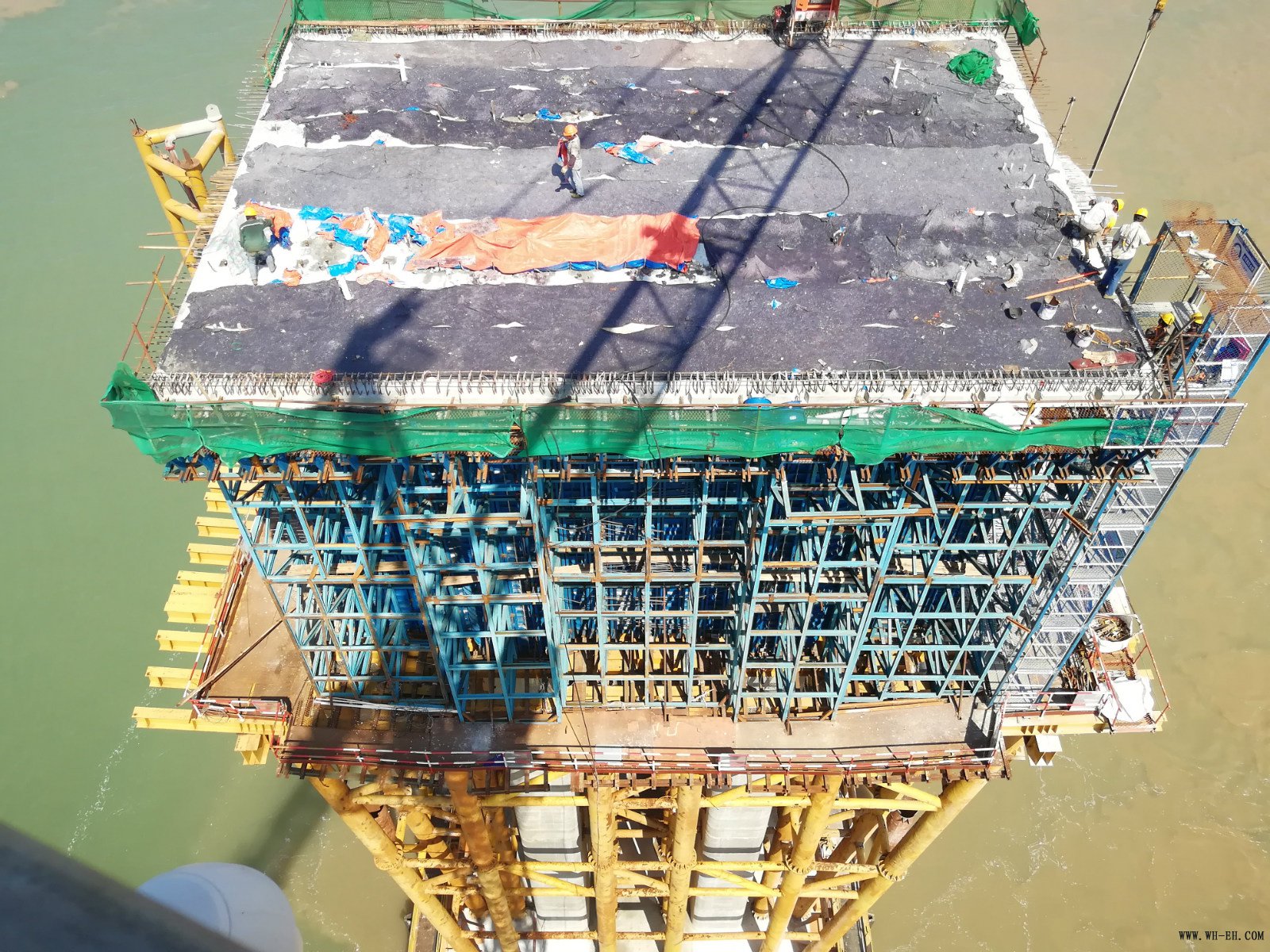 舟岱大桥北通航孔桥为一连刚构混凝土节段梁桥。。。。。。。。若是把大桥主墩的桩基比作人的双腿,,,,,,那么0号块就如人的躯干,,,,,,节段梁就如人的双臂,,,,,,北通航孔桥节段梁就是从0号块最先逐步“长出来”,,,,,,直至大桥合龙。。。。。。。。本次施工的主墩的0号块,,,,,,纵向长17.4米,底部宽5.5米,,,,,,顶部宽12.55米,,,,,,接纳现浇混凝土施工,,,,,,分两层举行浇筑,,,,,,共浇注方量888.3立方。。。。。。。。