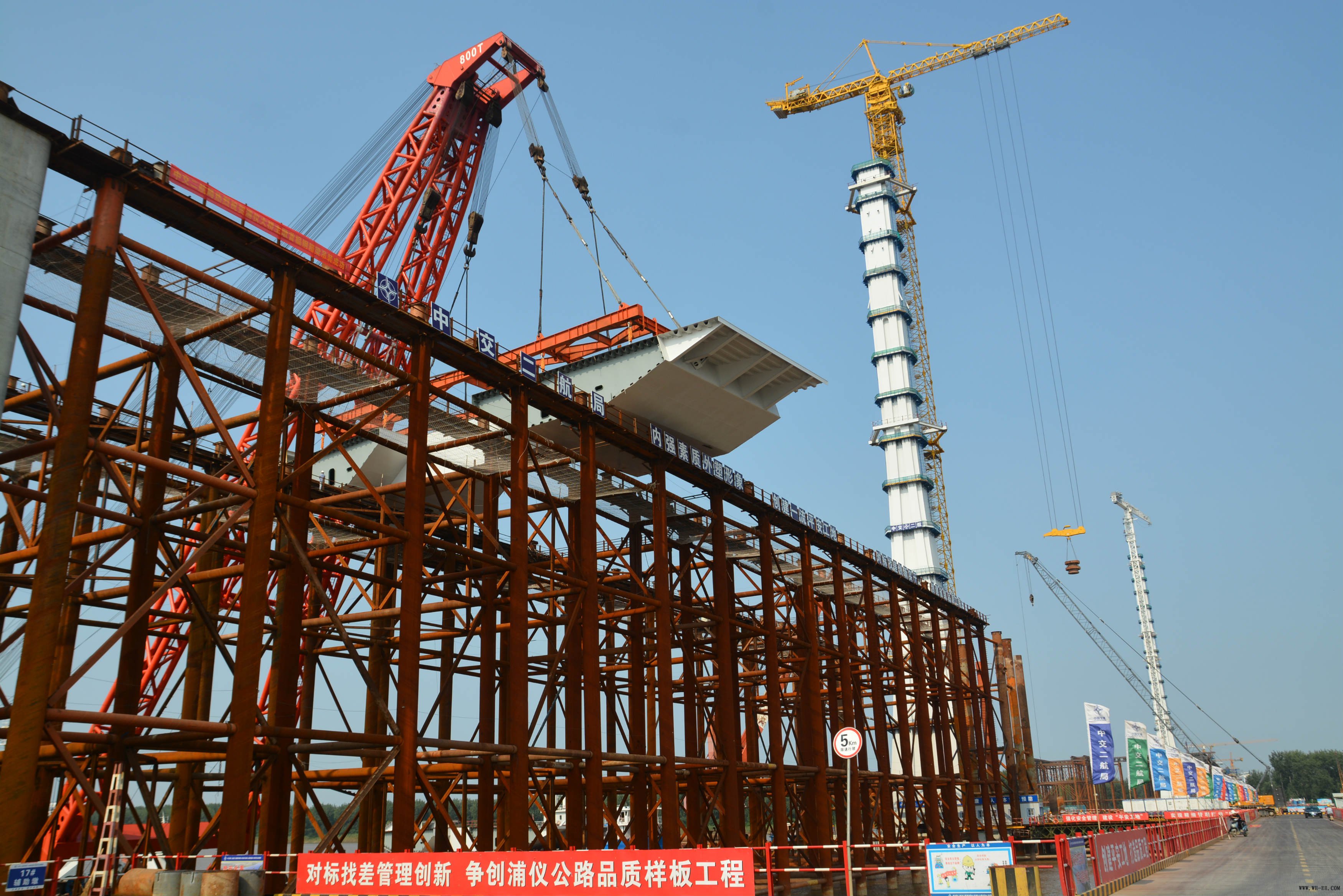 浦仪大桥主桥钢箱梁横断面总宽54.4米,,,,,,,钢箱梁断面分幅安排在索塔两侧,,,,,,,外腹板外侧设置行人与非无邪车道,,,,,,,单幅箱梁宽22.05米。。。。。主钢箱梁划分为8种类型,,,,,,,均接纳全断面焊接方法。。。。。主梁装置分索塔区、边跨和次边跨、中跨。。。。。其中,,,,,,,索塔区、边跨和次边跨区钢箱梁接纳800t起重船吊装、滑移就位,,,,,,,中跨梁段使用2×250吨桥面吊机吊装。。。。。