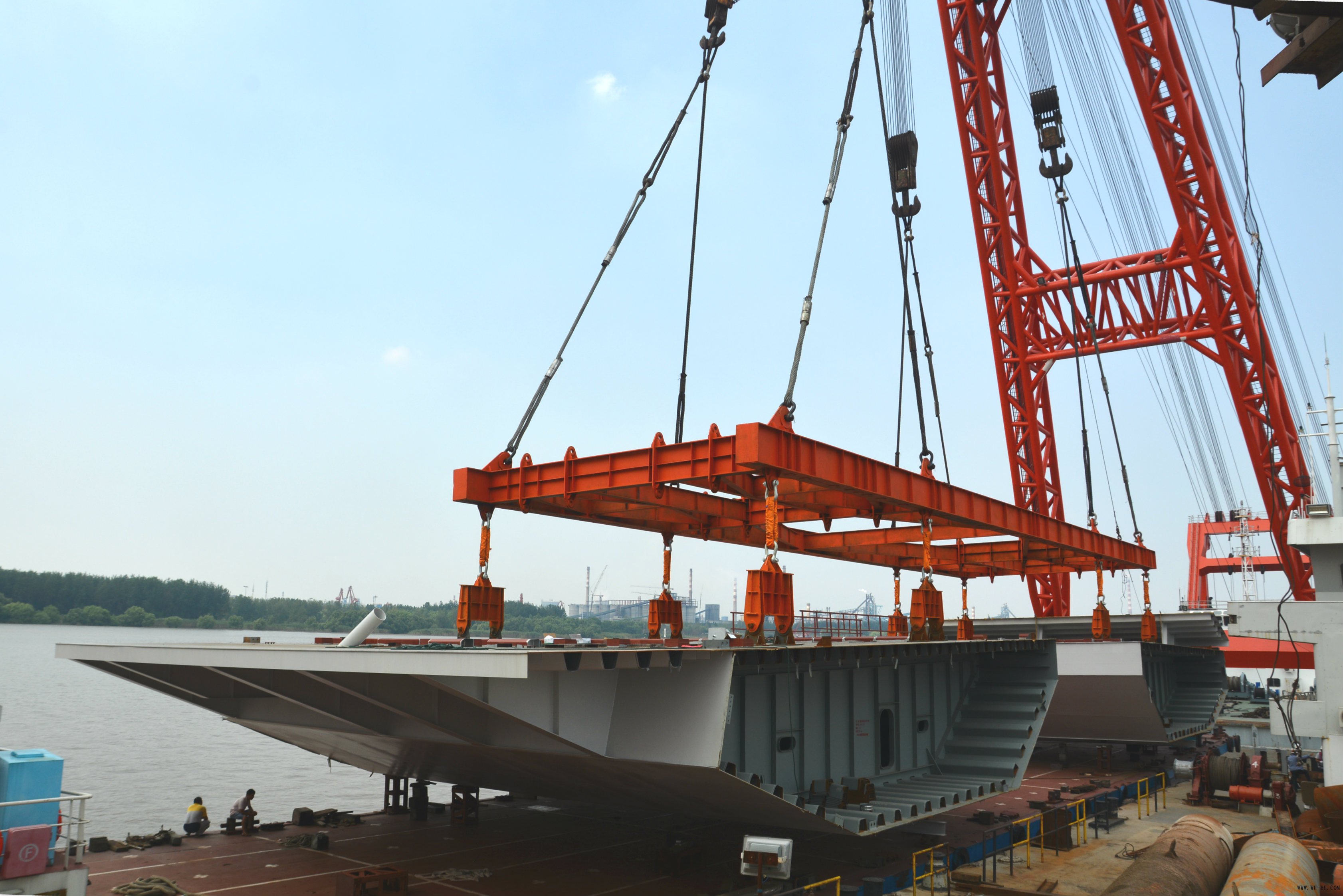 此次起吊存放的首榀钢箱梁为浦仪大桥主桥WB8#钢箱梁,,,,,,,长54.4米,,,,,,,宽16米,,,,,,,单榀自重393吨,,,,,,,加上起重船的吊具,,,,,,,起重总重达470吨,,,,,,,通过起重能力达800吨的秦工88#起重船,,,,,,,将WB8#钢箱梁起吊存放在高达40米的预存梁支架上。。。。。