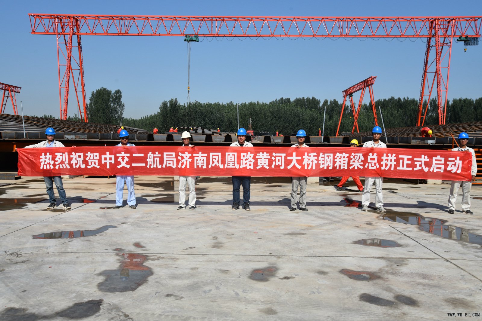 克日,,,,,,,,济南凤凰路黄河大桥南北两岸双线先后启动现场钢箱梁总拼,,,,,,,,钢箱梁施工由此进入要害阶段。。。。。。。
