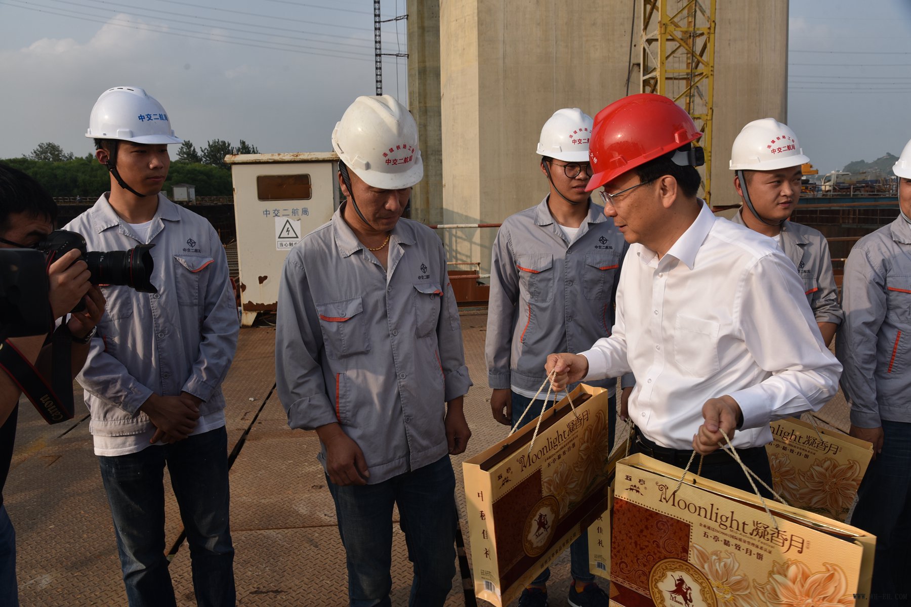在施工现场,,,,,,夏新旻将慰问品送到项目一线建设者手中,,,,,,并与建设者亲热握手,,,,,,向他们的辛勤支付体现敬意。。。。。慰问品分发完后,,,,,,夏新旻听取了大桥指挥部指挥长韦庆冬对工程概况以及现在施工进度的先容,,,,,,并对项目的希望状态及管理事情给予了充分的一定。。。。。