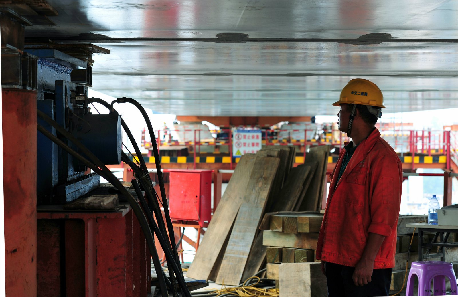 “这种步伐很省力,,,,,我们只是简朴的操作。。。。。。。。”“在钢槽梁下面,,,,,起风下雨都不怕。。。。。。。。”在顶推作业现场,,,,,工人看着千斤顶,,,,,听着油泵“滋滋”的声音,,,,,显得很悠然,,,,,甚至可以说说“闲话”。。。。。。。。