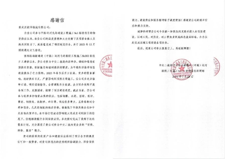 克日,,,,,航科物流公司广西事业部收到优德88官网网站二航局西部陆海新通道(平陆)运河枢纽工程施工№SN3标段项目司理部谢谢信。。。。。。。。