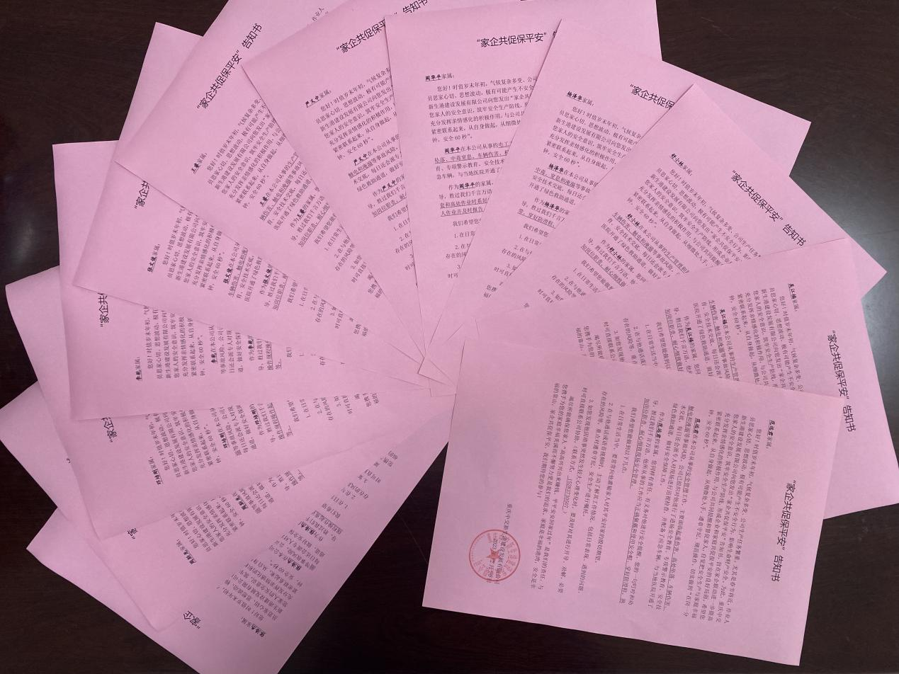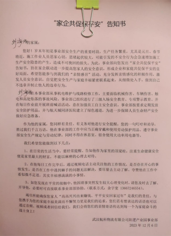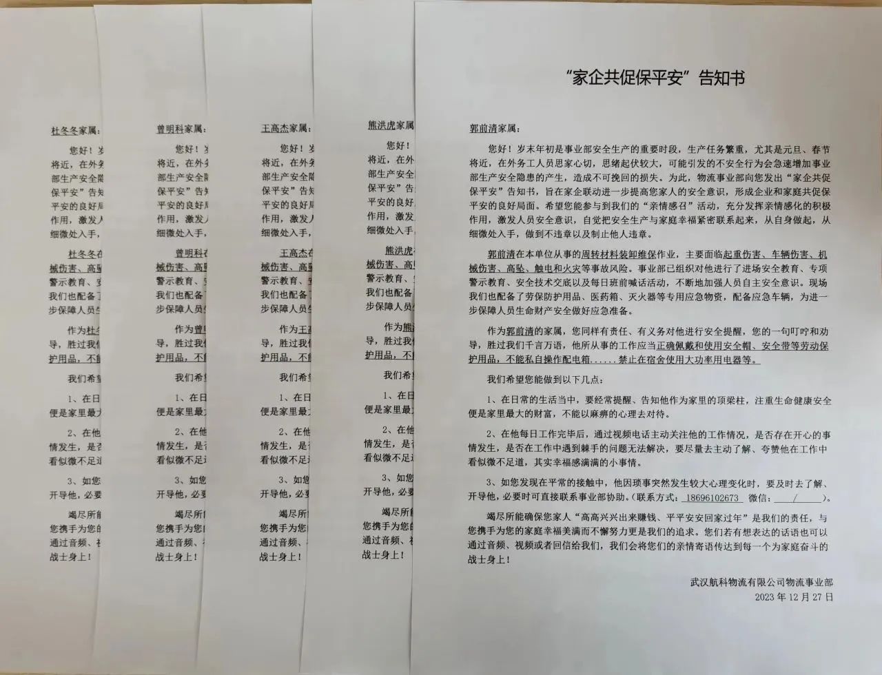 12月27日,,,,,物流事业部向现场作业班组员工眷属发出“家企共促保平安”见告书,,,,,旨在增进员工眷属相识员工一样平常作业危害,,,,,通过家企联动进一步提高员工家人的清静意识,,,,,形成企业和家庭共促保平安的优异时势。。。。。