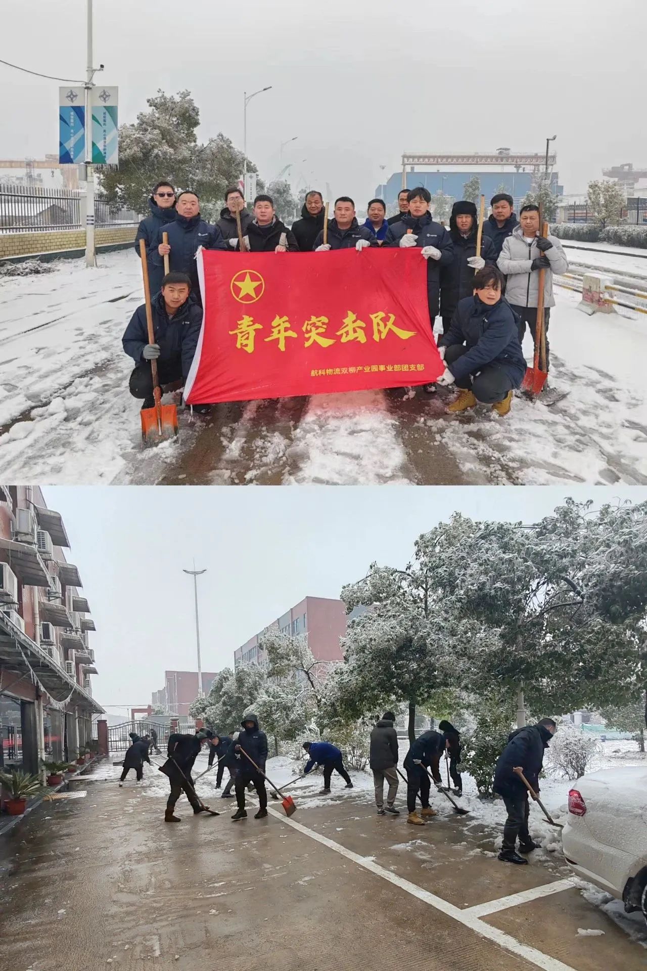 事业部党员、团员、入园企业代表组成青年突击队,,,,,,,扫除办公区、堆场、进港大道、码头等园区要害位置冰雪,,,,,,,消除蹊径结冰打滑清静隐患,,,,,,,包管园区职员、车辆流通出行。。。。。。。。
