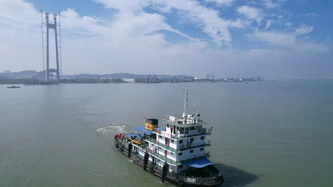 克日,,,,,,,,在南京仙新途经江通道建设现场,,,,,,,,牵引船拽拉着先导索,,,,,,,,跨越1760米长江水域,,,,,,,,由南主塔牵引至北主塔,,,,,,,,南、北主塔实现“隔江一线牵”,,,,,,,,为接下来大桥上部结构牵引系统装置及猫道架设涤讪坚实基础。。。。。。