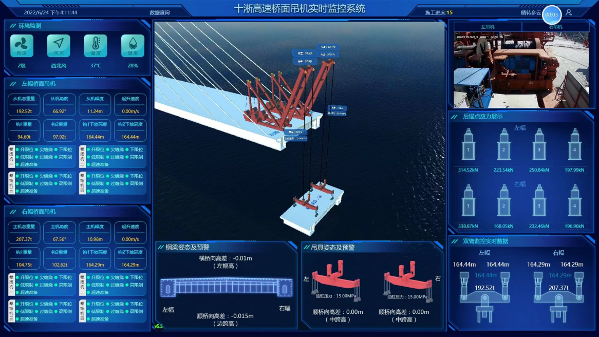 钢梁吊装施工实时监控系统,,,,,,建设了物联网收罗系统,,,,,,在吊机结构和主梁上装置了种种高精度传感器,,,,,,与装备控制系统举行数据交互,,,,,,监测数据实时上传至云端服务器举行实时剖析处置惩罚;;;;;;;建设了基于数字孪生的三维施工厂景,,,,,,开发了交互式展示界面,,,,,,实时展示虚拟仿真施工状态,,,,,,凭证吊机盘算报告设置清静运行指标,,,,,,对吊机施工历程中装备运行状态、卷扬机和吊具坐标与姿态、梁体空中姿态举行周全监测和预警,,,,,,实时推送数据超限警报,,,,,,确保主梁清静施工,,,,,,实现了施工厂景可视化、清静管理数据化、管理决议细腻化,,,,,,提高了工程智能化和信息化水平。。。。。。