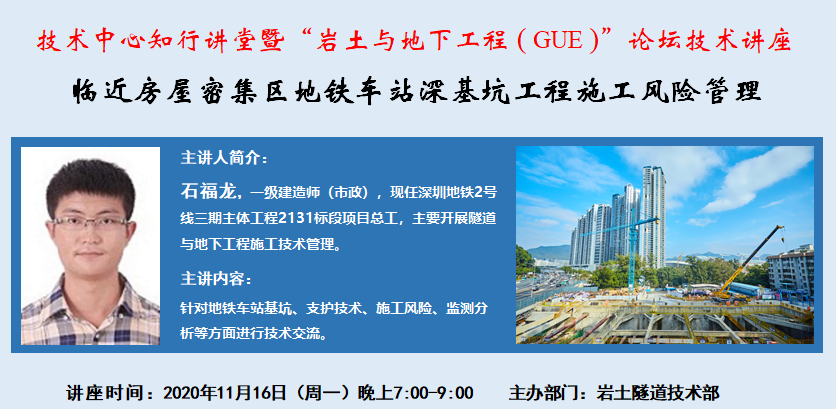 应手艺中心知行课堂暨岩土隧道手艺部“岩土与地下工程(GUE)”论坛运动约请,,,,,,,,11月16日,,,,,,,,深圳地铁2号线三期主体工程2131标段项目总工程师石福龙开展了题为“邻近衡宇麋集区地铁车站深基坑工程施工危害管理”的专家手艺交流。。。。。。手艺中心、优德88官网网站广州公司及成都地铁、佛山地铁、福州地铁等项目部共45名手艺职员加入了本次交流。。。。。。