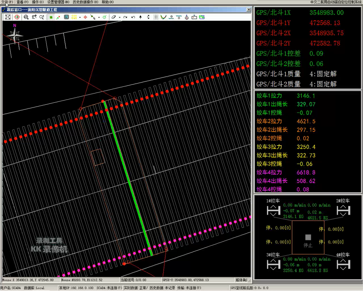 项目沉管垫层卵石垄长度35.2m,,,,,,垄宽1.8m,,,,,,由整平船沿垄宽偏向逐垄一连铺设。。。。。整平船作业时以锚泊形式举行船位的调解及定位,,,,,,自动锚泊移船定位系统通过读取船体双卫星定位系统实时坐标、锚机现实移动速率、锚机现实控制距离、锚机现实拉力、锚机控制速率和锚机收/放缆状态等数据,,,,,,可一键操控四台锚机举行收放缆绳。。。。。通过二航局独创的移船算法,,,,,,控制分步举行,,,,,,精度逐步增强,,,,,,在一定的情形条件下能够做到船位实时调解,,,,,,包管垫层铺设的定位精度,,,,,,同时提高逐垄移船定位的效率,,,,,,为沉管基床整平的施工进度提供了有力包管。。。。。