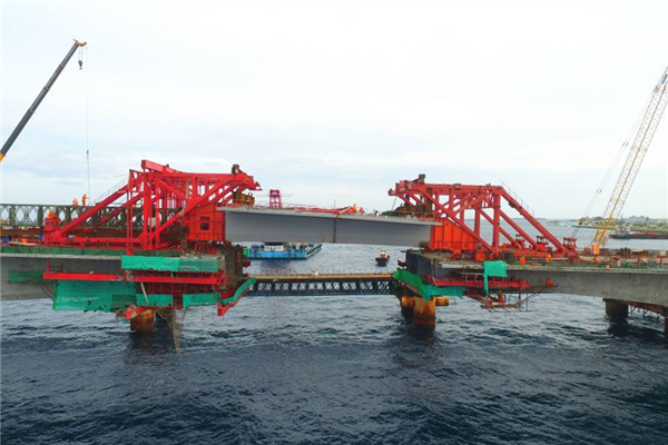 6月4日,,,,,,经由近50个小时的一连奋战,,,,,,中马友谊大桥首节钢箱梁(以下称“三号钢箱梁”)顶推到位。。。。。。
