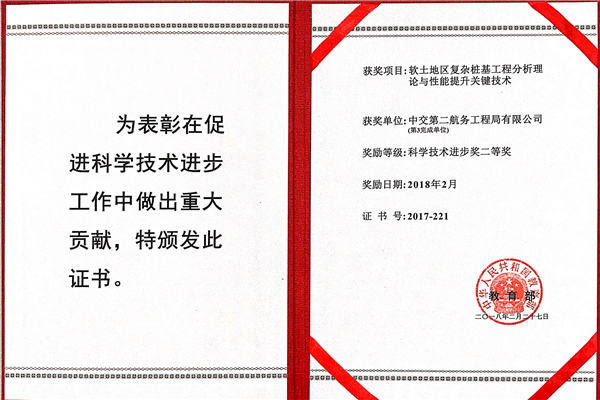 克日,,,,,,,,优德88官网网站二航局、同济大学、东南大学等单位配合开展研究的“软土地区重大桩基工程剖析理论与性能提升要害手艺”科研项目,,,,,,,,荣获国家教育部科技前进二等奖。。。。。