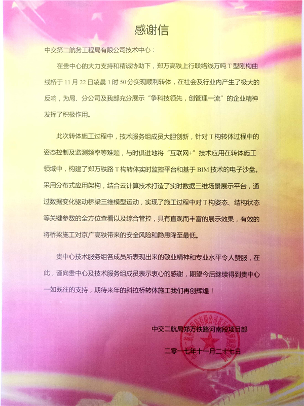 克日,,,,,,,郑万铁路河南段项目部就郑万高铁上行联络线万吨T型刚构曲线桥转体手艺服务事情向手艺中心发来谢谢信,,,,,,,敌手艺服务组成员在此次转体施工历程中的事情给予高度的赞赏。。。。。。。。另悉,,,,,,,郑万铁路客运专线河南有限责任公司向我公司发来贺电体现祝贺,,,,,,,并对奋战在一线的全体建设者体现谢谢和慰问。。。。。。。。