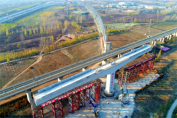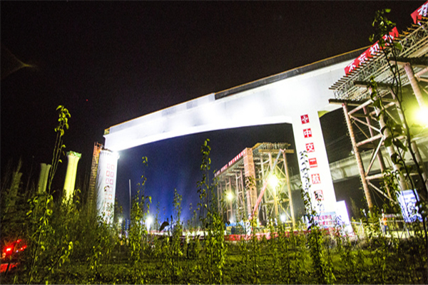 郑万上行联络线跨越京广高铁处,,,,,,接纳(73.7+73.7)米T构上跨通过,,,,,,线路位于R=2500米的平曲线上,,,,,,纵坡8.9‰,,,,,,曲线横向偏心达0.226米。。。。。施工接纳与京广高铁平行的支架现浇,,,,,,通过转体系统转动至目的位置,,,,,,转体角度为50°。。。。。转盘结构接纳滑道撑脚支持与中心球铰定位相团结的球铰转动系统,,,,,,球铰设计承载力100000千牛。。。。。