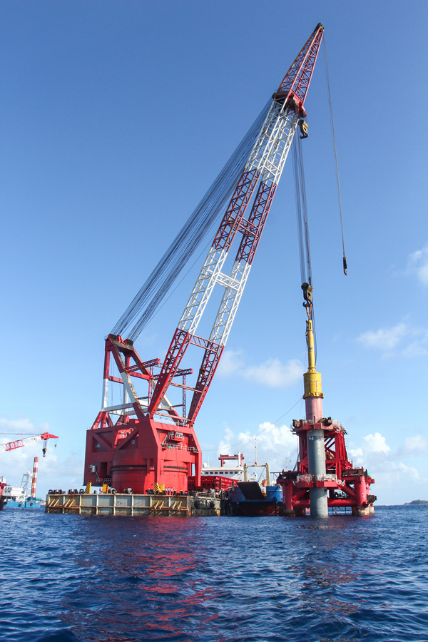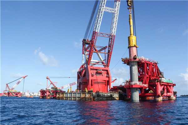 中马友谊大桥位于马尔代夫北马累环礁,,,,,,毗连环礁上马累岛、机场岛和胡鲁马累岛三个相邻岛屿,,,,,,是马尔代夫最主要的岛屿毗连线工程。。。。。。蹊径全长2.0km,,,,,,其中主桥为五墩六跨组合混淆梁V型墩刚构桥,,,,,,主跨180m,,,,,,主桥长760m。。。。。。主桥基础为35根3.2m/3.6m钻孔灌注桩,,,,,,其单根钢护 筒最大重量达218t。。。。。。