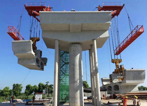 该项目的梁段施工要领为,,,,,,,,首先完成下部结构施工,,,,,,,,并在其上浇筑0号块,,,,,,,,然后由中心墩往两侧对称悬臂拼装,,,,,,,,梁段均接纳桥面吊机吊装。。。。。其中,,,,,,,,0号块和1号块之间需要在施工现场浇筑湿接缝,,,,,,,,1号块调位和湿接缝浇筑均在桥面吊机上完成,,,,,,,,与其他项目有显着差别。。。。。