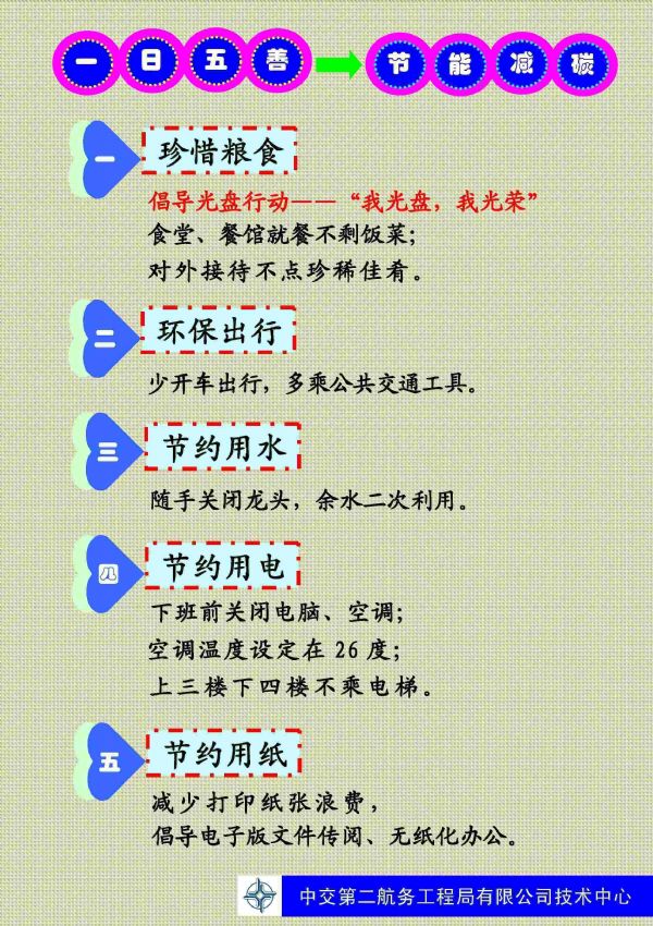 “一日五善 节能减碳”,,, ,,,,是手艺中心“节能·减碳·环保”运动的建议主题,,, ,,,,主要内容则由五句话组成,,, ,,,,即“珍惜粮食——食堂、餐馆就餐不剩饭菜,,, ,,,,对外接待不点珍稀佳肴,,, ,,,,提倡光盘行动,,, ,,,,‘我光盘,,, ,,,,我庆幸’;;;; ;;; ;环保出行——少开车出行,,, ,,,,多乘公共交通工具;;;; ;;; ;节约用水——随手关闭龙头,,, ,,,,余水二次使用;;;; ;;; ;节约用电——下班前关闭电脑、空调,,, ,,,,空调温度设定在26度,,, ,,,,上三楼下四楼不乘电梯;;;; ;;; ;节约用纸——镌汰纸张铺张,,, ,,,,提倡电子版文件传阅、无纸化办公。。。。 。。。。”每一条都与员工的事情、生涯息息相关,,, ,,,,是对“节能·减碳·环保”最简朴直白的建议;;;; ;;; ;善即德,,, ,,,,也是对每一位员工提升品行修养的最基本要求。。。。 。。。。